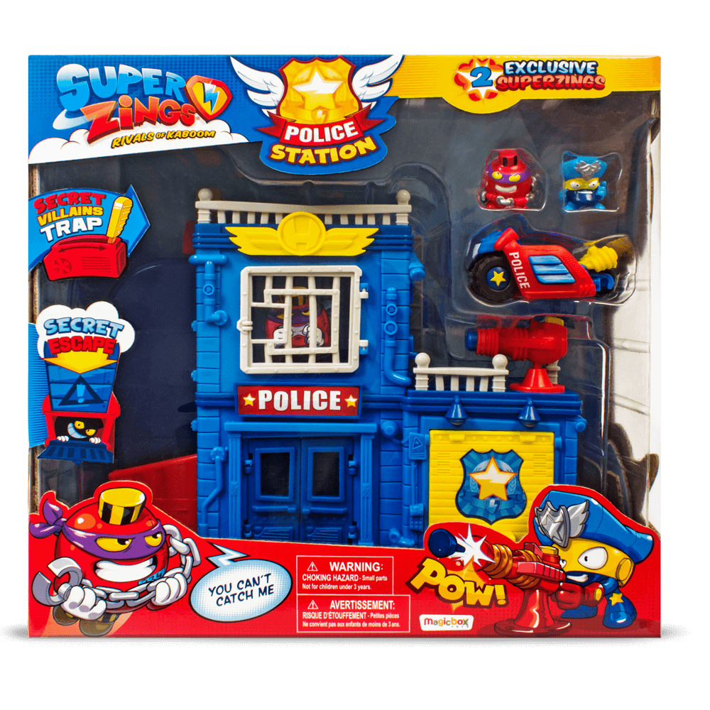 Kaboom City è un posto sorprendente, e imparando a conoscerla scoprirai che da quelle parti la polizia ha sempre molto da fare! E la Stazione di Polizia di Kaboom City è un posto decisamente pieno di sorprese: con una speciale trappola per i cattivi, un cannone sul tetto e un passaggio segreto per rocambolesche fughe, non ci si annoia mai! Chuck Chain riuscirà ad evadere o Captain Justice sarà più furbo di lui? Pattuglia le strade di Kaboom City con la moto della polizia e costruisci le tue avventure. E i due SuperThings inclusi nella confezione sono super esclusivi, li trovi solo qui! Benvenuto a Kaboom City, la città dei SuperThings!